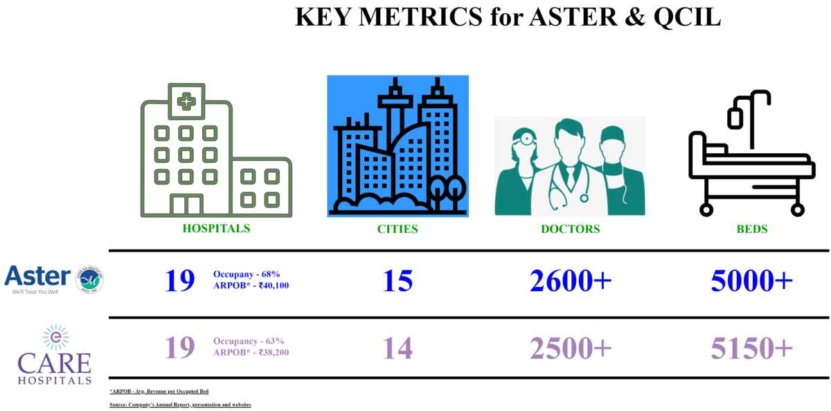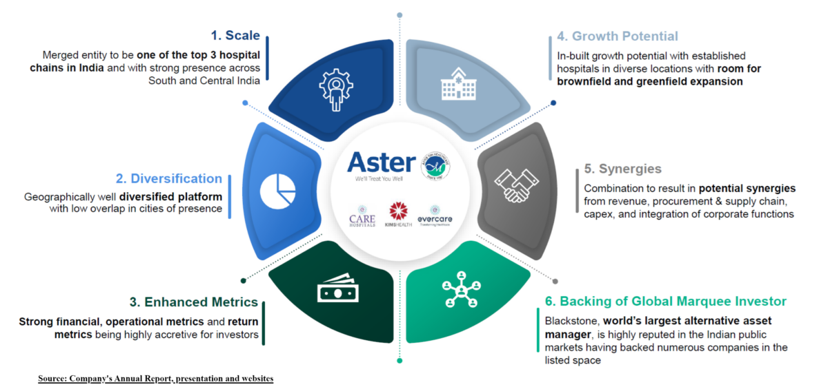 There are several reasons for ringing the merger. Aster DM Quality Care Limited will have a combined portfolio of four leading brands: Aster DM, CARE Hospitals, KIMSHEALTH and Evercare. The combined entity will have a network of 38 hospitals and 10,150+ beds spread across 27 cities making it one of the top 3 hospital chains in India.