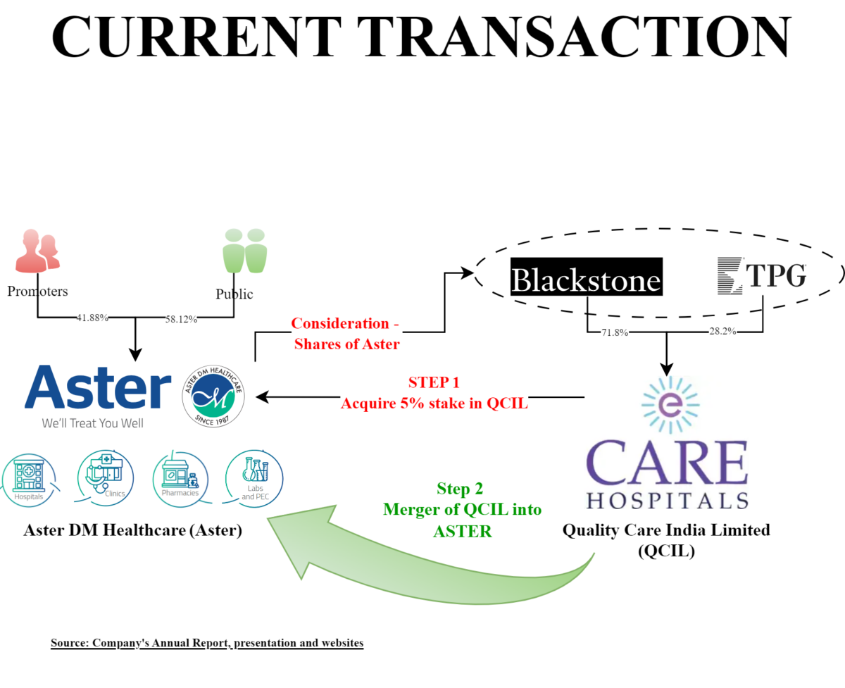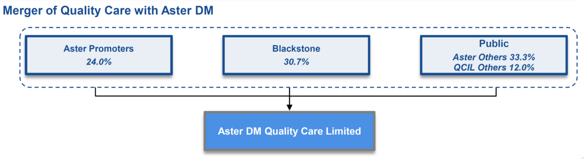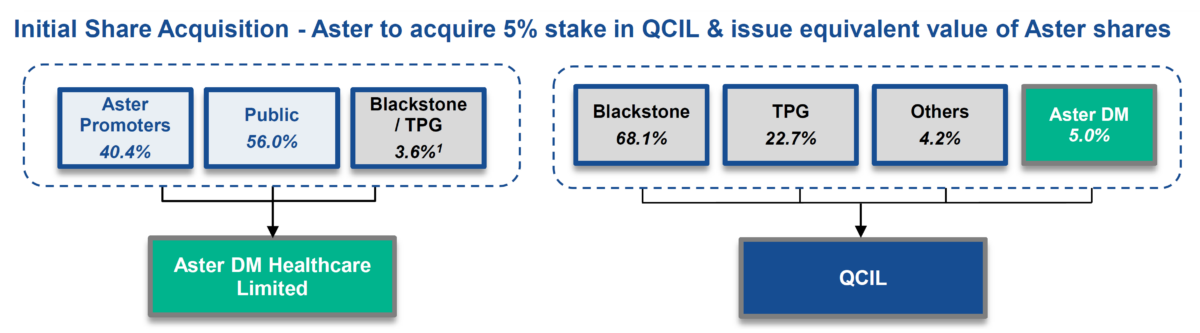 Please note that the above shareholding pattern of the Aster-Post merger is considering the acquisition transaction. Pursuant to the acquisition of 5% stake in QCIL by Aster, Blackstone & TPG will hold circa 3.6% stake in Aster before merger execution. Further, currently TPG owns 23.9% stake in QCIL.