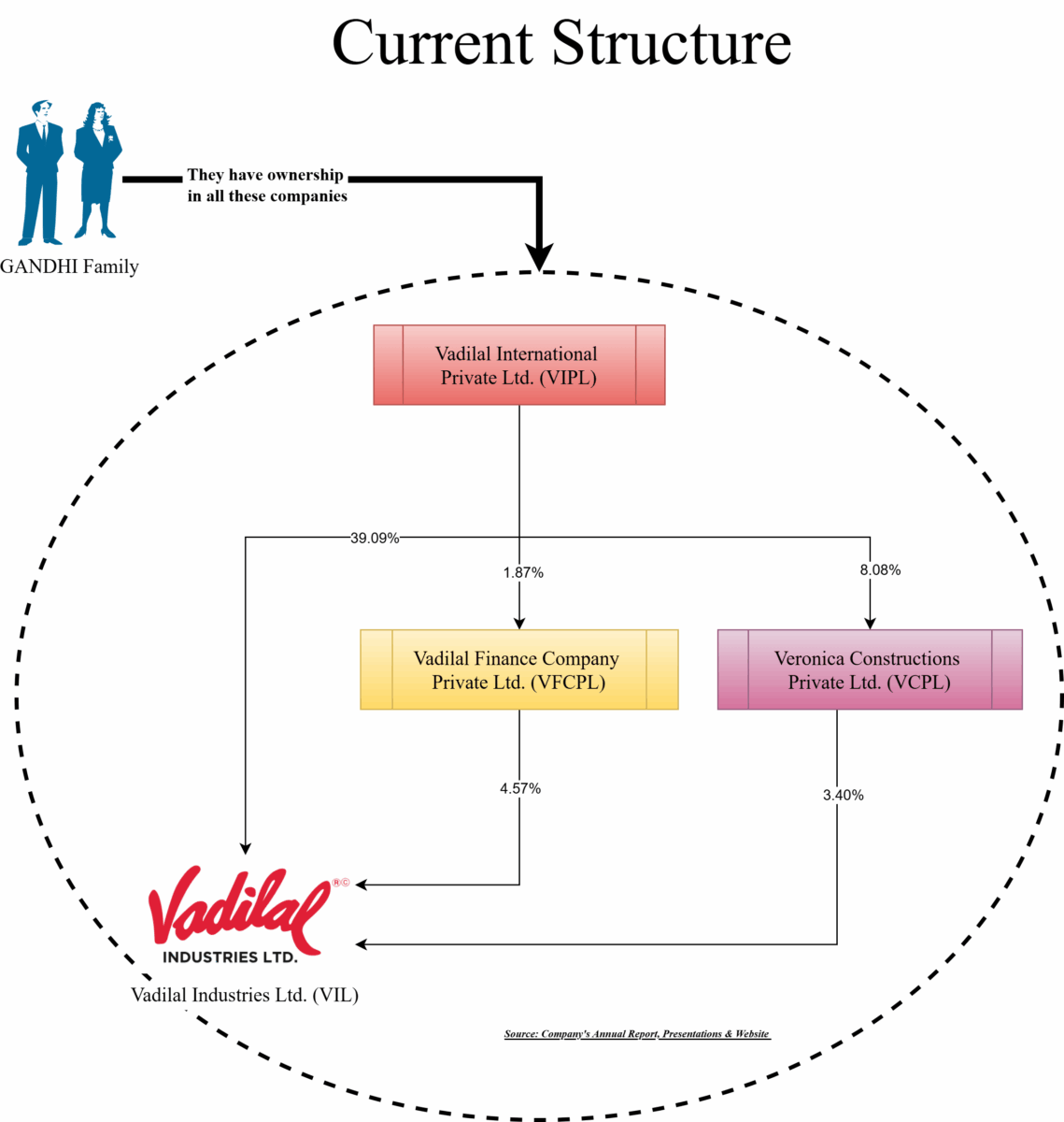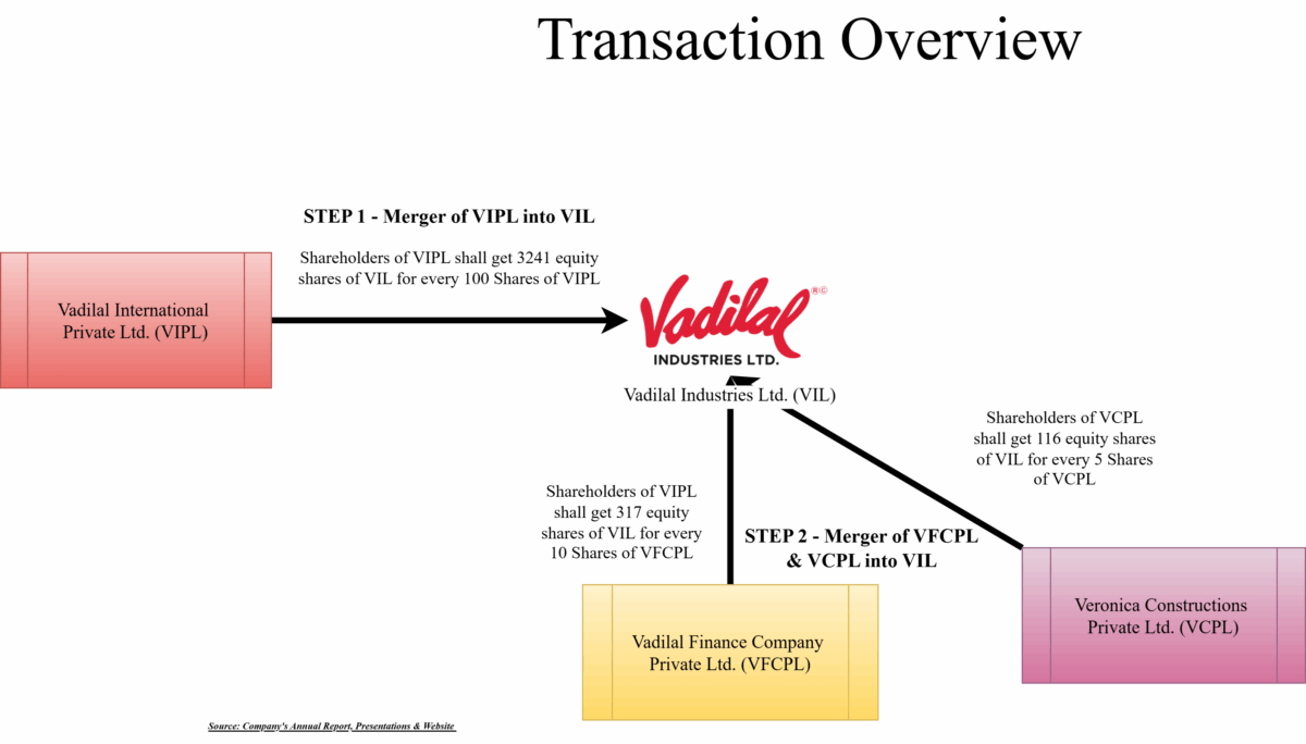 Essentially, through an amalgamation scheme, Vadilal group will consolidate the “Vadilal” brand into VIL and most promoter holdings in VIL are currently held through promoter entities which due to the merger shall usher in direct holding by the promoters.